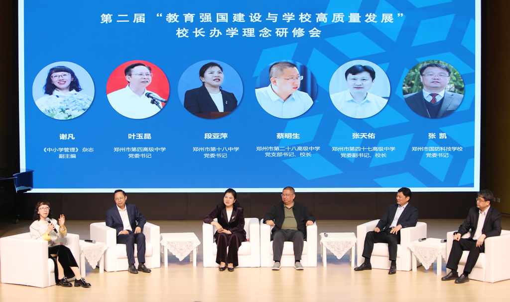 随后的圆桌对话环节由《中小学管理》杂志副主编谢凡主持,郑州市第四高级中学党委书记叶玉昆,郑州市第十八中学党委书记段亚萍,郑州市第二十八高级中学党支部书记、校长蔡明生,郑州市第四十七高级中学党委副书记、校长张天佑,郑州市国防科技学校党委书记张凯等五位学校负责人结合本校实践,就育人方式变革、特色课程建设、教师队伍激励、普职融通探索等话题展开深入交流,在思想碰撞中凝聚育人共识、探寻发展良方。