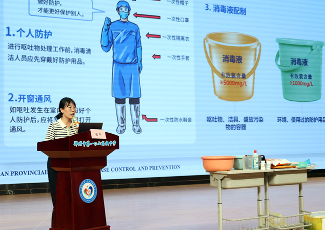 随后,河南省疾控中心传染病预防控制所副主任医师申晓靖就诺如病毒感染性腹泻等学校常见传染病防控技术进行专题培训;河南省疾控中心消毒与媒介生物控制研究所副主任医师张玉勤就学校诺如病毒感染性腹泻防控消毒技术开展培训;河南省疾控中心消毒与媒介生物控制研究所张叶就学校诺如病毒呕吐物处置开展实操培训;河南省疾控中心结核病预防控制所信息与管理室主任徐吉英对如何防范学校肺结核进行培训。